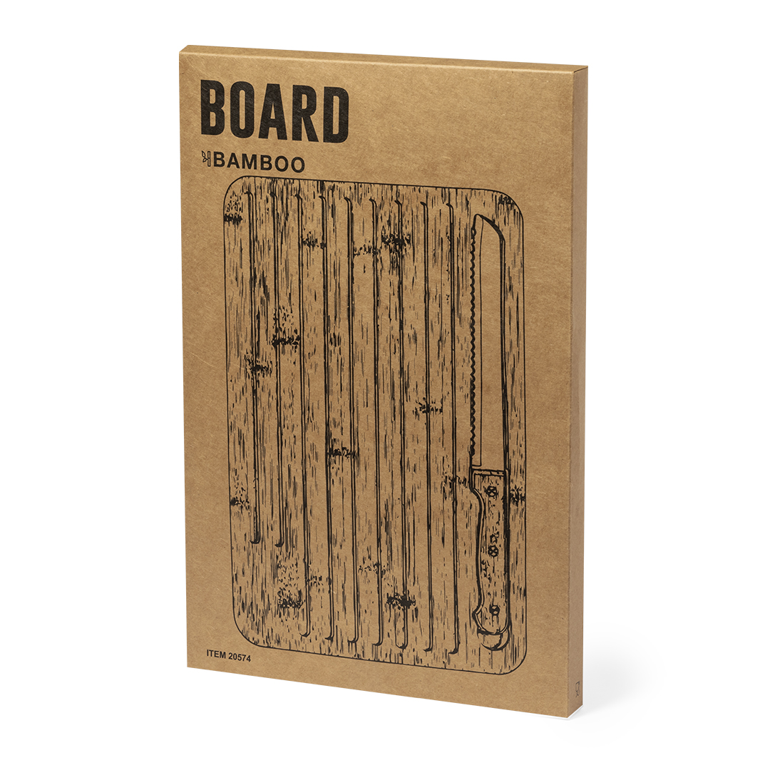 Kuhinjska deska iz bambusa, skupaj z nožem. Njegova gladka stran omogoča različne namene, druga pa ima v les vgravirane utore, ki so idealni za rezanje kruha ali sočne hrane. Vključuje predal z žaginim nožem z jeklenim rezilom in bambusovim ročajem.