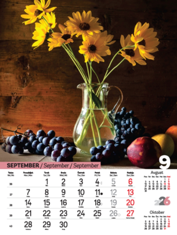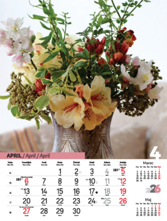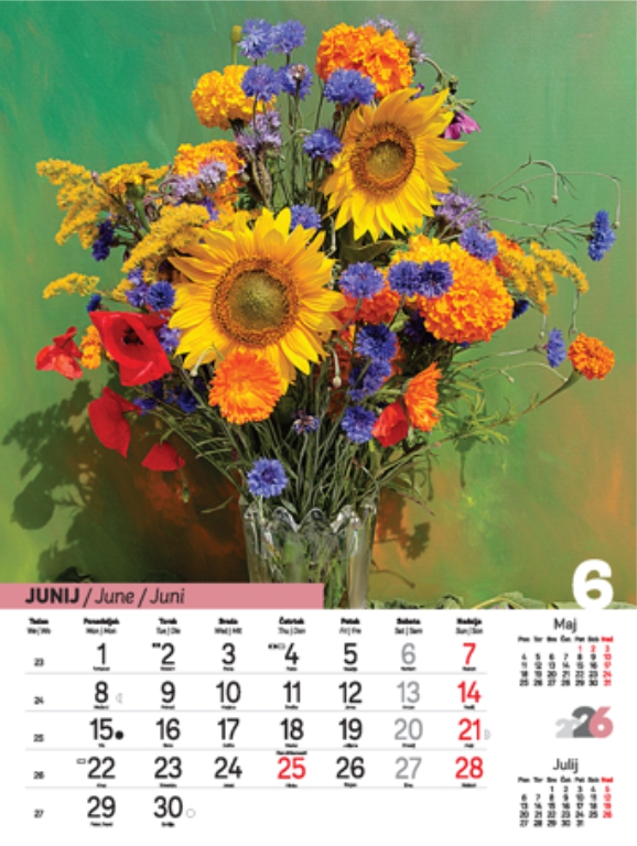 33 x 50, 13 listov, podložni karton, 135g premazni gloss papir, spiralna vezava, priložena vrečka,trijezični (SLO, ANG, NEM), označeni slo. prazniki, lune.