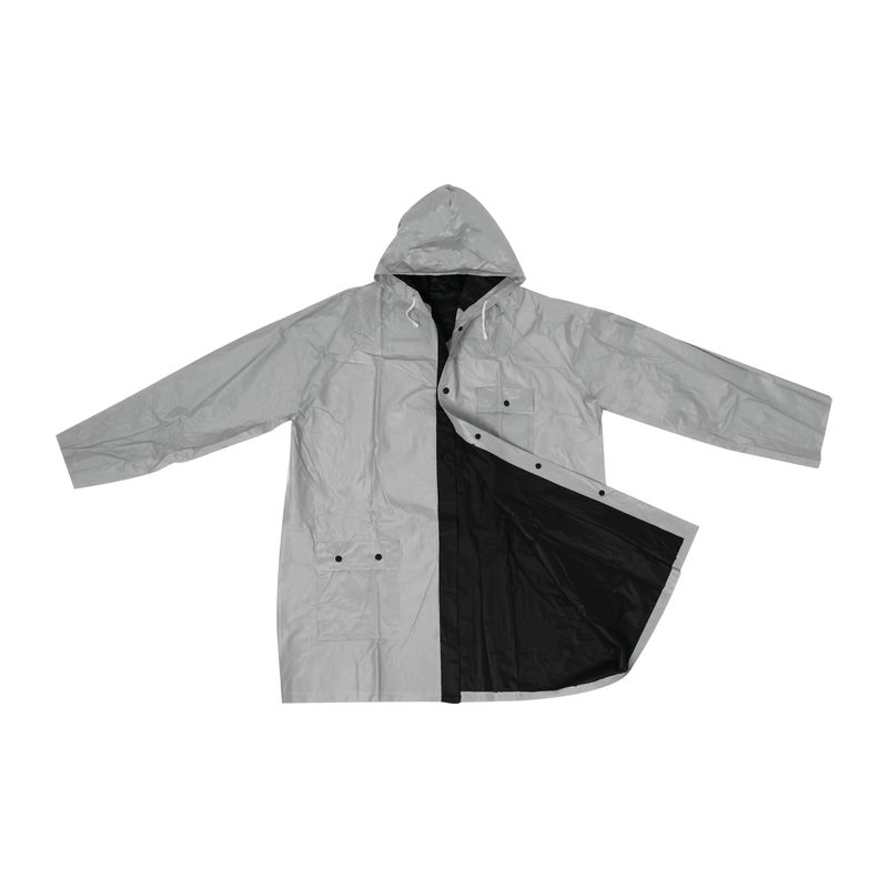 Dvobarvni obojestranski dežni plašč, izdelan iz PVC, v standardni velikosti XL s gumbi in kapuco. Lahko ga nosimo v obe strani.