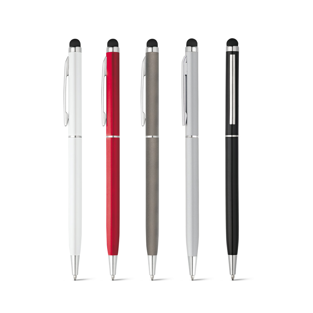 Aluminijast kemični svinčnik z zasučnim mehanizmom, sponko in gumico za ekran na dotik. Modro črnilo. ø8 x 135 mm