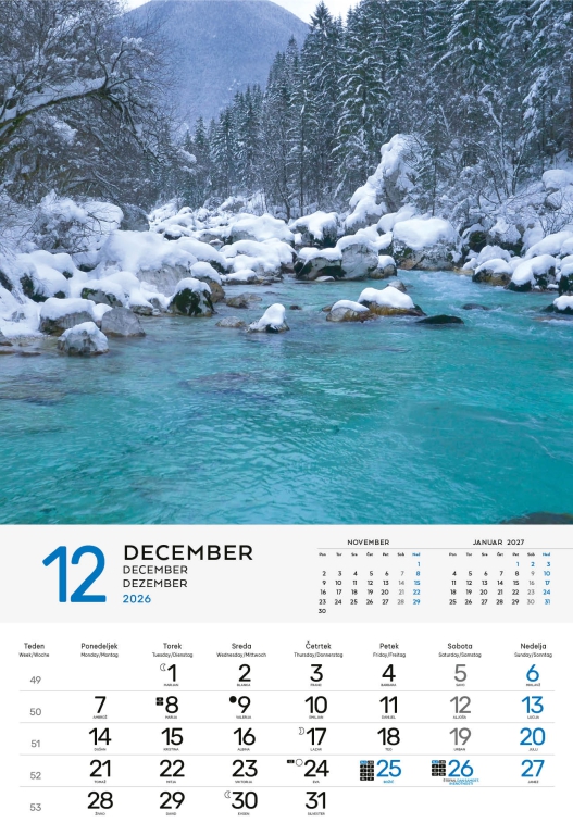 dimenzija 33 x 54 cm, za dotisk 33 x 6 cm, obseg 13 listov,jezik SLO, špiralna vezava, 135 g biogloss, natron vrečka