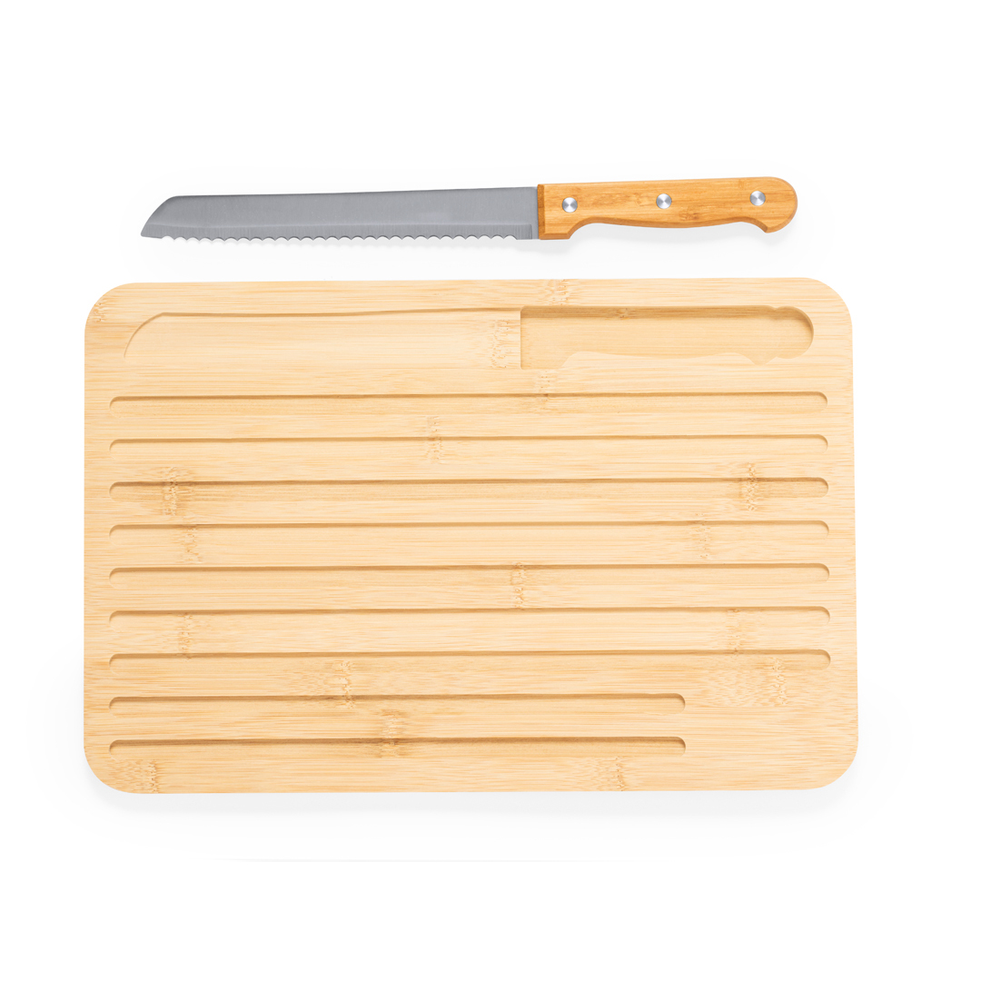 Kuhinjska deska iz bambusa, skupaj z nožem. Njegova gladka stran omogoča različne namene, druga pa ima v les vgravirane utore, ki so idealni za rezanje kruha ali sočne hrane. Vključuje predal z žaginim nožem z jeklenim rezilom in bambusovim ročajem.