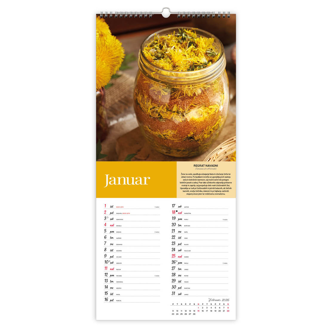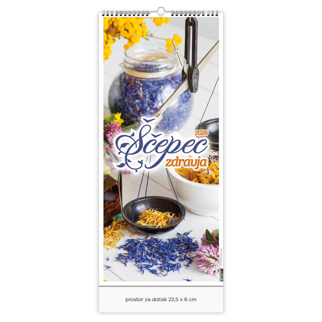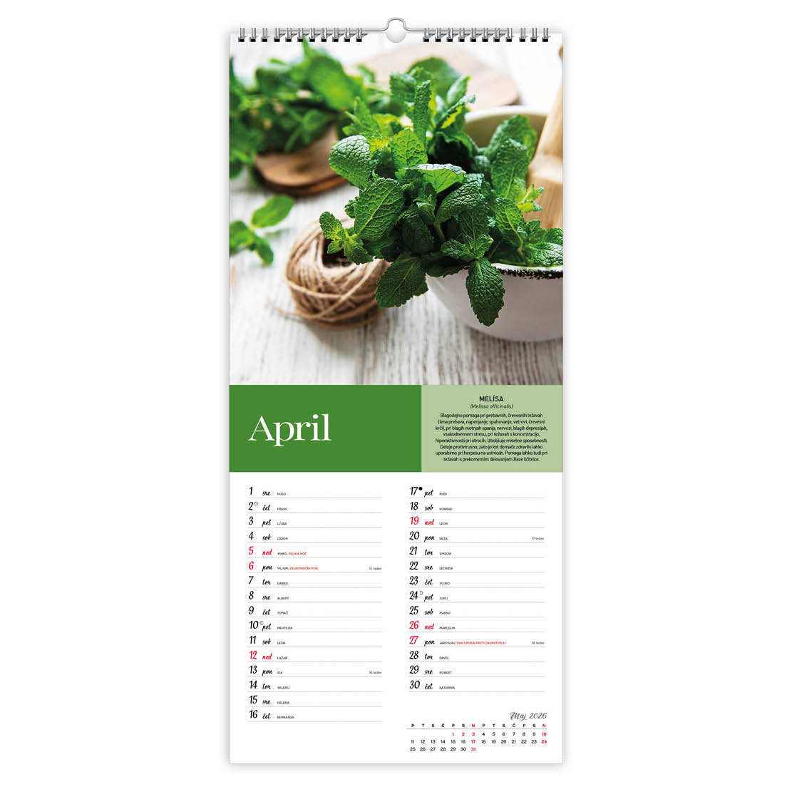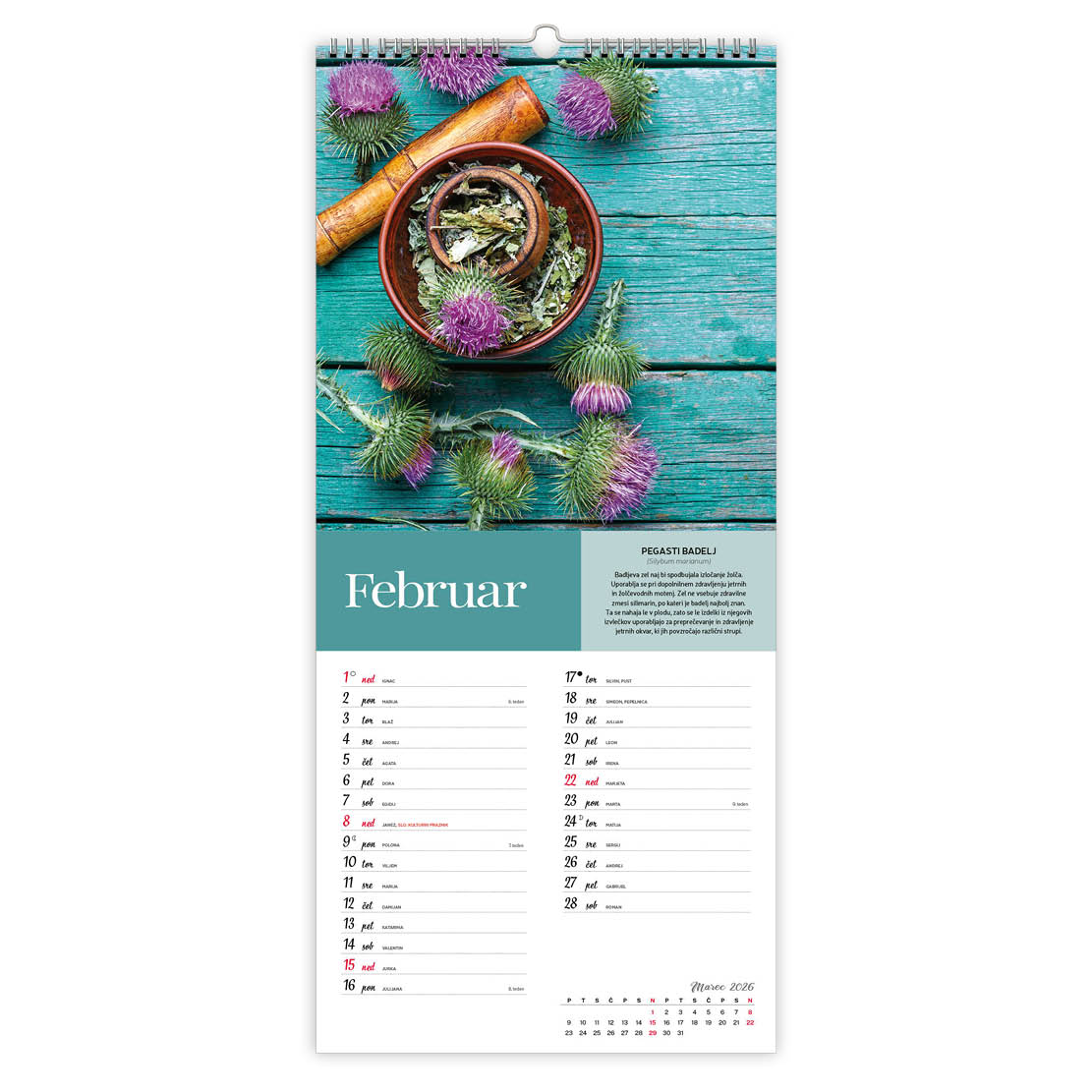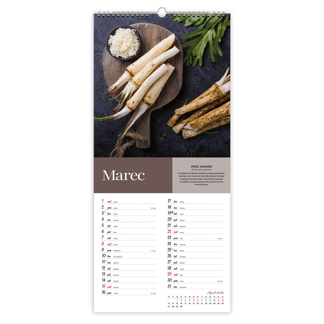22,5 x 55,5 cm, 13 listov, podložni karton, 135g premazni gloss papir, spiralna vezava, priložena natron vrečka,označeni slo. prazniki, imena, lune, tedni