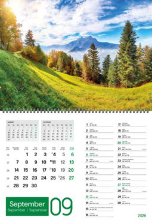 dimenzija (odprt) 33 x 54 cm, (zaprt) 33 x 27 cm, za dotisk 33 x 6 cm,obseg 13 listov, jezik SLO/ANG/NEM, špiralna vezava, 135 g biogloss,natron vrečka